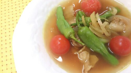 ししとうとミニトマトを加えていったん火を止める。